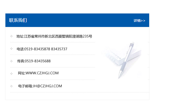 傳真:0519-83435688    郵編:213135    網址:WWW.czjhgj_com.htdq-yz.com    電子郵箱:JH@czjhgj_com.htdq-yz.com